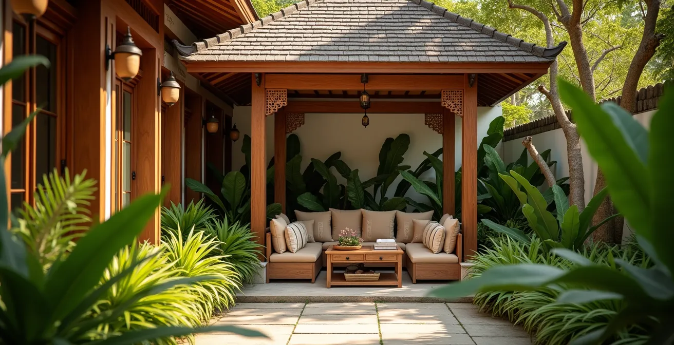 Ein Interieur von wahrer Qualität zeichnet sich durch seine Zurückhaltung aus. Es überlädt den Raum nicht, sondern lässt den Materialien und der Architektur Raum zum Atmen. Die Komposition konzentriert sich auf wenige, aber sorgfältig ausgewählte Elemente: eine elegant geschwungene Rattan-Liege, eine schlichte Seladon-Keramikvase oder ein kunstvoll geschnitztes Holzelement am Giebel. Das Licht spielt eine entscheidende Rolle – oft wird das weiche, natürliche Licht durch Lamellenfenster oder offene Veranden gefiltert, was eine ruhige, fast meditative Atmosphäre schafft.